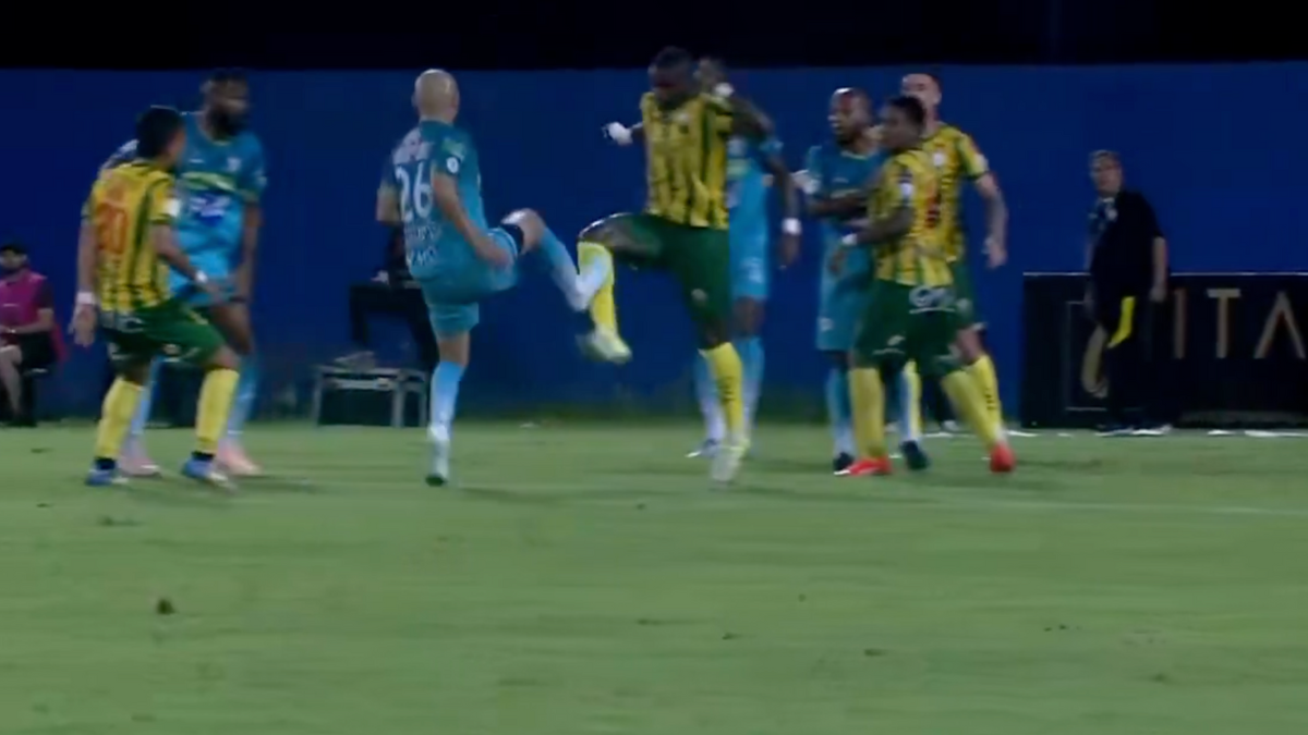 En el tiempo de adición, Daniel Padilla de Jaguares levantó la pierna en una disputa por el balón y terminó golpeando accidentalmente a José Leudo. Sin embargo, el juez Alejandro Moncada sancionó una supuesta infracción del jugador de Real Cartagena y señaló penal a favor de Jaguares.