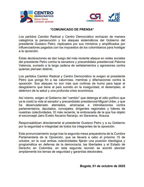 “Cambio Radical y Centro Democrático rechazan de manera categórica la persecución y los ataques sistemáticos del Gobierno del presidente Gustavo Petro, replicados por sus ministros y amplificados por influenciadores pagados con los impuestos de los colombianos para hostigar a la oposición”, señalan.