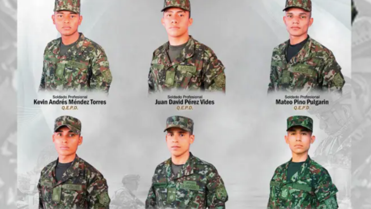Soldado Jaime Alejandro Cárdenas Ramírez, los soldados profesionales Mateo Pino Pulgarín, Juan David Pérez, Vides, Kevin Andrés Méndez Torres y Jhon Fredy Moreno Sierra y el soldado Brando Daniel Valderrama Martínez. ´
