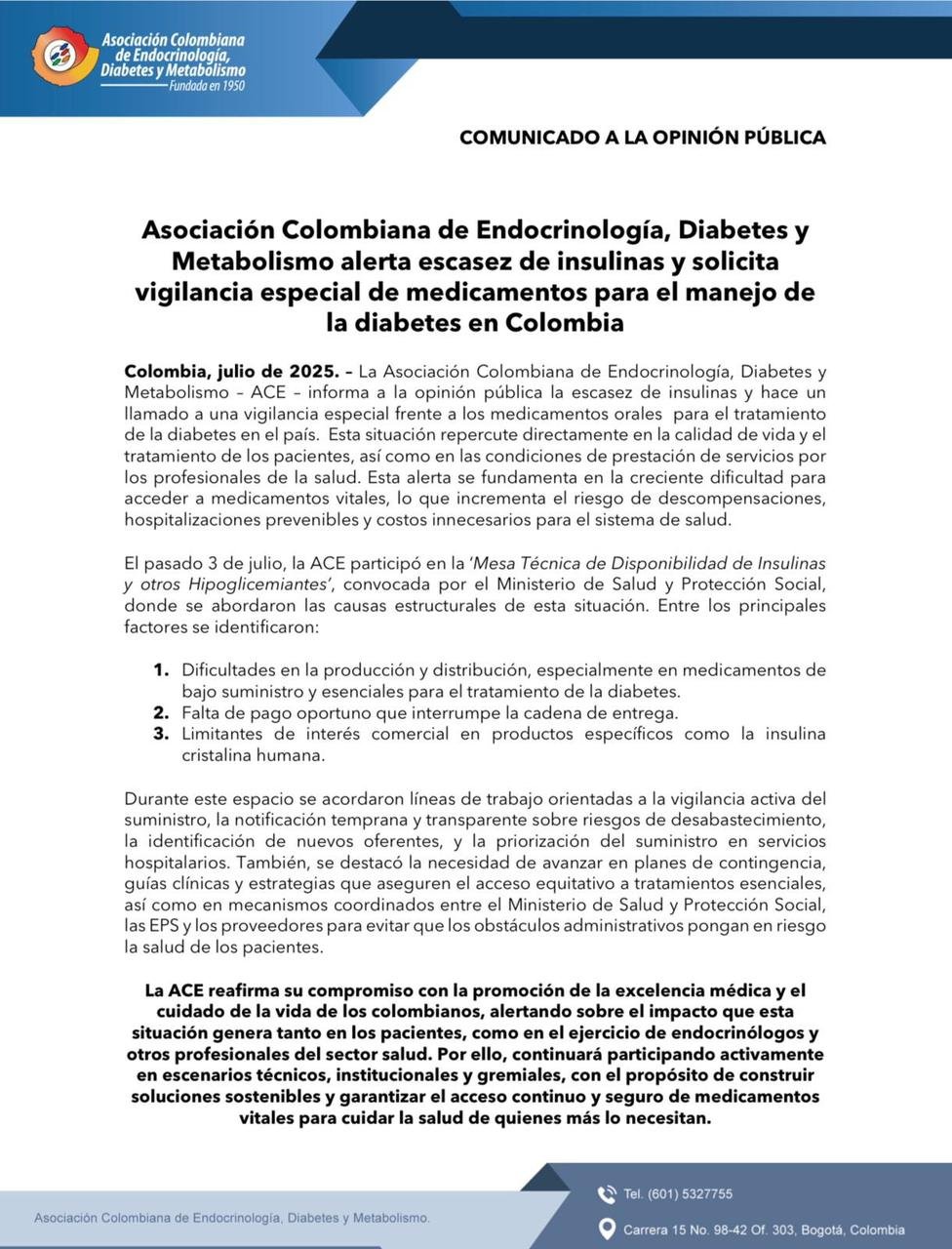 La alerta la lanzó la Asociación Colombiana de Endocrinología, Diabetes y Metabolismo -ACE- . “Esta situación repercute directamente en la calidad de vida y el tratamiento de los pacientes, así como en las condiciones de prestación de servicios por los profesionales de la salud”, señala a través de un comunicado.