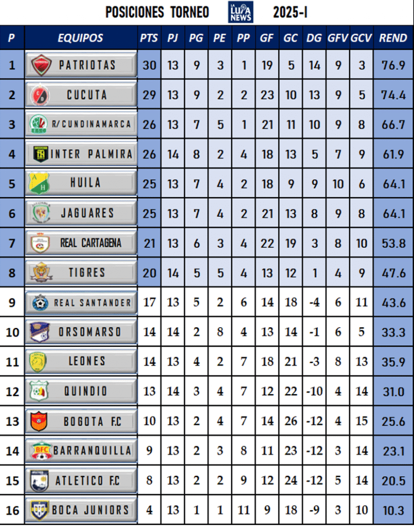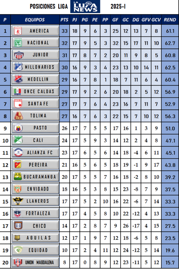 Tabla de posiciones Liga BetPlay 2025-I