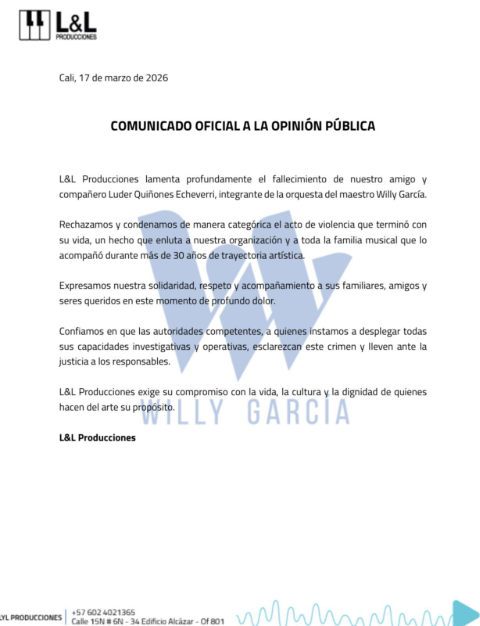 “Rechazamos y condenamos de manera categórica el acto de violencia que terminó con su vida, un hecho que enluta a nuestra organización y a toda la familia musical que lo acompañó durante más de 30 años de trayectoria artística”, afirmó el grupo de García.