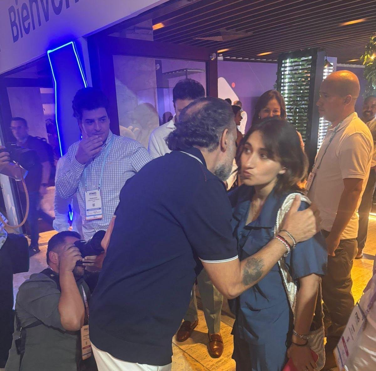 El escenario fue Cartagena, donde se realiza la Convención de Asobancaria a la que ambos asistían. Una foto registra el momento en que se saludan, de beso, en las afueras del recinto e incluso intercambian algunas palabras, ante varias miradas de de estupefacción alrededor.